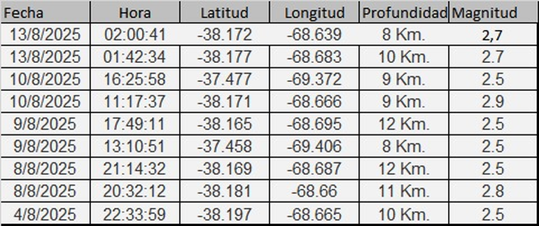 Además, otro récord que se registró durante esta primera quincena de agosto fue la presencia de dos temblores por día de escala mayor a 2,5 en cuatro jornadas distintas: el 8, 9, 10 y 13. Todos tuvieron magnitudes entre 2,5 y 2,9; y una profundidad entre 8 y 12 kilómetros. "Si sigue así, se va a convertir en el año que más tiemble Vaca Muerta", afirmó Grosso.