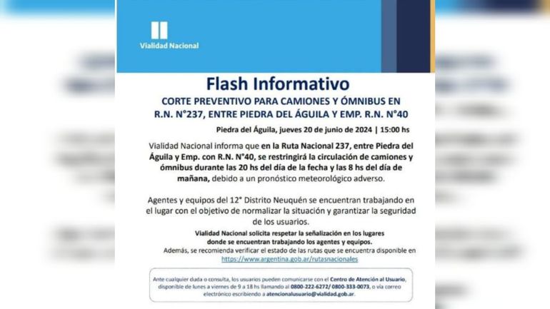 "Tenemos nieve en Piedra del Águila, Collón Curá, ruta 40 sur, la zona de los lagos, Aluminé, Villa Pehuenia", dijo Cruz y aclaró que los pasos internacionales de Pino Hachado y Mamuil Malal están intransitables. En el caso de Pino Hachado, no abrirá durante toda la jornada, mientras que Mamuil Malal presenta acumulación de nieve, por lo que habrá que esperar al nuevo parte del mediodía para saber si es posible cruzar a Chile por ese paso. Ante el acierto de los pronósticos, señaló que se está trabajando para asistir potenciales complicaciones con personal de Policía, Bomberos, Defensa Civil y el Ejército, en caso de que sea necesario.