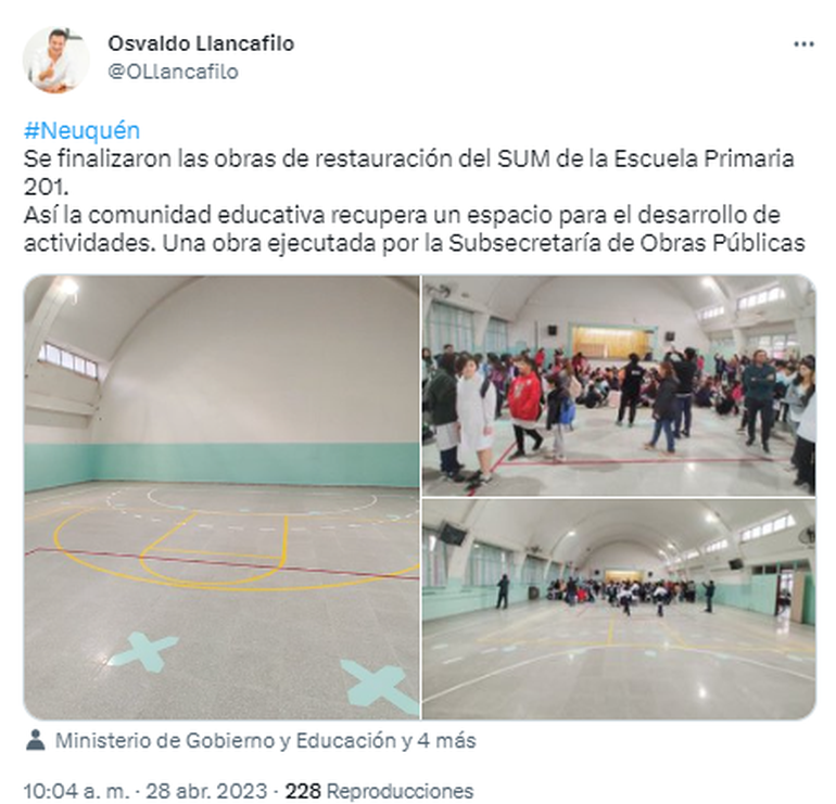 El renovado Salón de Usos Múltiples de la Escuela Primaria Nº 201 de Neuquén capital comenzó a utilizarse este viernes. Los trabajos del edificio incluyeron submuración a dos metros de profundidad en todo el sector, compactación con calcáreo, pilotaje, recalce de muro, nuevas columnas y vigas, contrapiso en toda el área del SUM y colocación de granito compacto. Además, se pintó la mampostería y canchas de básquet, vóley, fútbol, y handball.