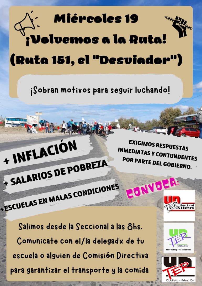 Por su parte, desde la seccional cipoleña del gremio docente Unter informaron que -en el marco del paro de 72 horas de esta semana- se movilizarán sobre la Ruta Nacional 151, a la altura de "El desviador", en Barda del Medio.