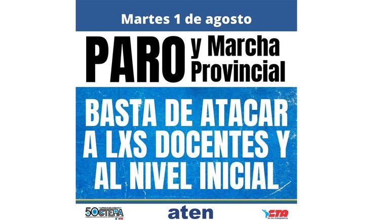 El gremio ATEN informó de una jornada de paro y movilización provincial para el martes 1 de agosto contra la “demonización” que está siendo objeto los docentes del nivel inicial tras las denuncias por abusos sexuales a alumnos de jardines de infantes.