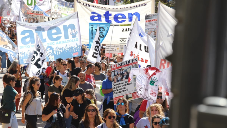 Una nutrida movilización del gremio ATEN, otros sindicatos y algunas agrupaciones políticas y sociales se movilizaban este martes al mediodía a 16 años de la muerte del docente Carlos Fuentealba, durante un operativo policial por una protesta en Arroyito.