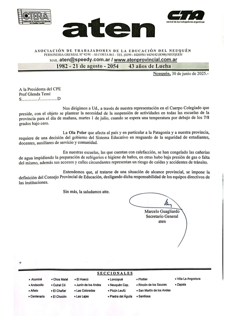 “La ola polar que afecta al país y en particular a la Patagonia y a nuestra provincia, requiere de una decisión del gobierno del Sistema Educativo en resguardo de la seguridad de estudiantes, docentes, auxiliares de servicio y comunidad”, expresa el documento enviado por la conducción de ATEN, firmado por su secretario general, Marcelo Guagliardo.