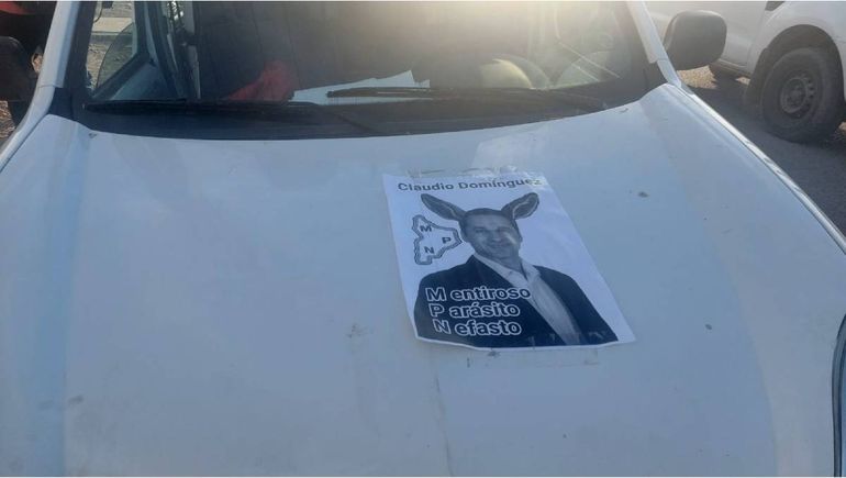 “Dónde están los 60 mil millones para educación”, dicen, además de pedir la renuncia a la ministra de Educación, Soledad Martínez. Algunos de los carteles en los vehículos de los docentes sindicalizados, apuntaron contra el diputado provincial por el MPN, Claudio Domínguez. En la imagen del capot de un auto muestran un afiche con la cara del legislador, dos orejas de burro y el mapa del MPN. "Mentiroso, Parásito y Nefasto", dice el mensaje, en juego con las siglas del partido.