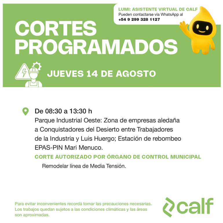 Calf anunció que este jueves realizará un corte de energía eléctrica de 8.30 a 13.30 en el Parque Industrial Oeste. Las zonas afectadas por el corte de luz serán las empresas que están próximas a las calles Conquistadores del Desierto entre Trabajadores de la Industria y Luis Huergo. También será extensivo a la Estación de Rebombeo EPAS-PIN-Mari Menuco.