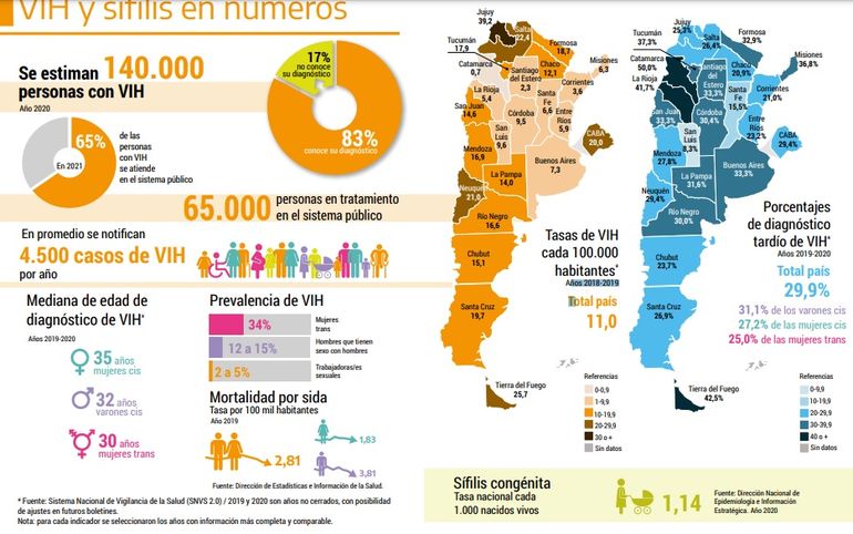 En el apartado "Resumen de indicadores básicos de VIH y sífilis por región y jurisdicción" de dicho informe, se especifica que en la provincia de Neuquén el porcentaje de diagnósticos tardíos de VIH en el período 2019-2020 fue del 29,4 por ciento y que "la Tasa de mortalidad por sida - cada 100.000 habitantes- fue del 3,4 por ciento.