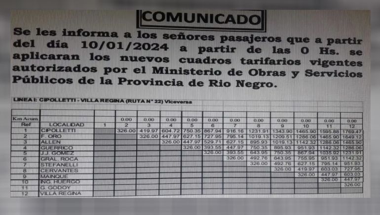 El incremento fue de un 30%, según lo que se informó en las últimas horas. La nueva tarifa rige solo para recorridos dentro de la provincia de Río Negro.