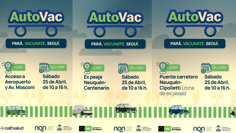 El despliegue del AutoVac tendrá puestos en el Puente Carretero Neuquén - Cipolletti (zona de ex peaje), el ex peaje de Neuquén - Centenario y el vacunatorio de CALF, que estará ubicado sobre Avenida Mosconi, en el acceso al aeropuerto. Todos los puestos funcionarán de 10 a 16 horas.