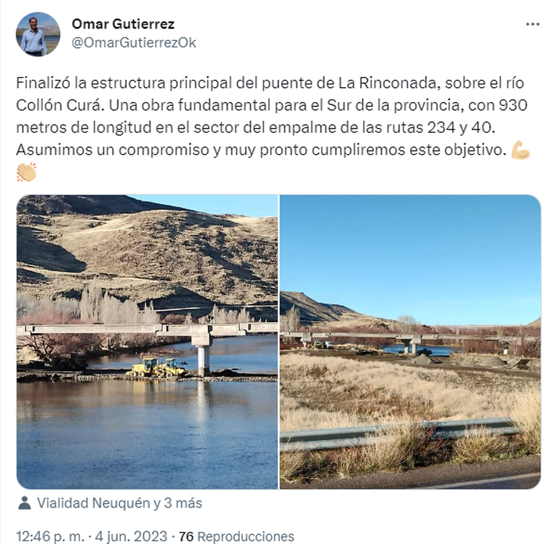 El gobernador Omar Gutiérrez destacó en sus redes que se trata de "una obra fundamental para el Sur de la provincia, con 930 metros de longitud en el sector del empalme de las rutas 234 y 40. Asumimos un compromiso y muy pronto cumpliremos este objetivo".
