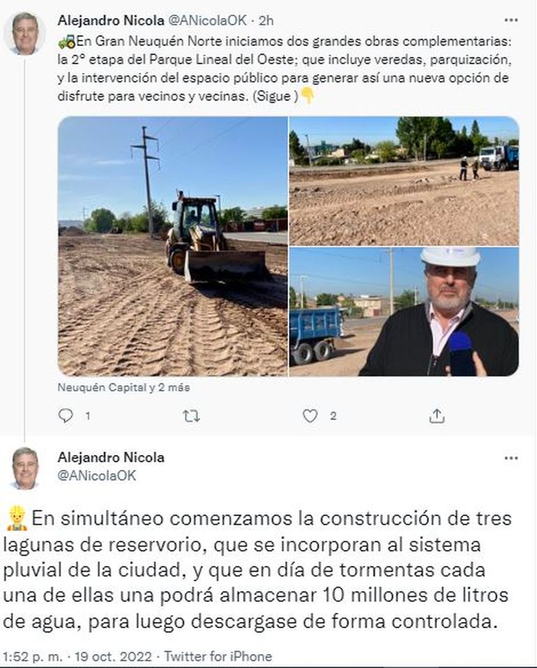 “El movimiento de obra tiene que ver con la construcción de tres lagunas de reservorio que servirán para que, en momentos de tormenta, cada laguna pueda almacenar 10 millones de litros”. En este sentido, Nicola explicó que en estos casos, permiten ir descargando el agua de forma controlada hacia el sistema pluvial que desemboca en los ríos y evitar que vaya corriendo por las calles.