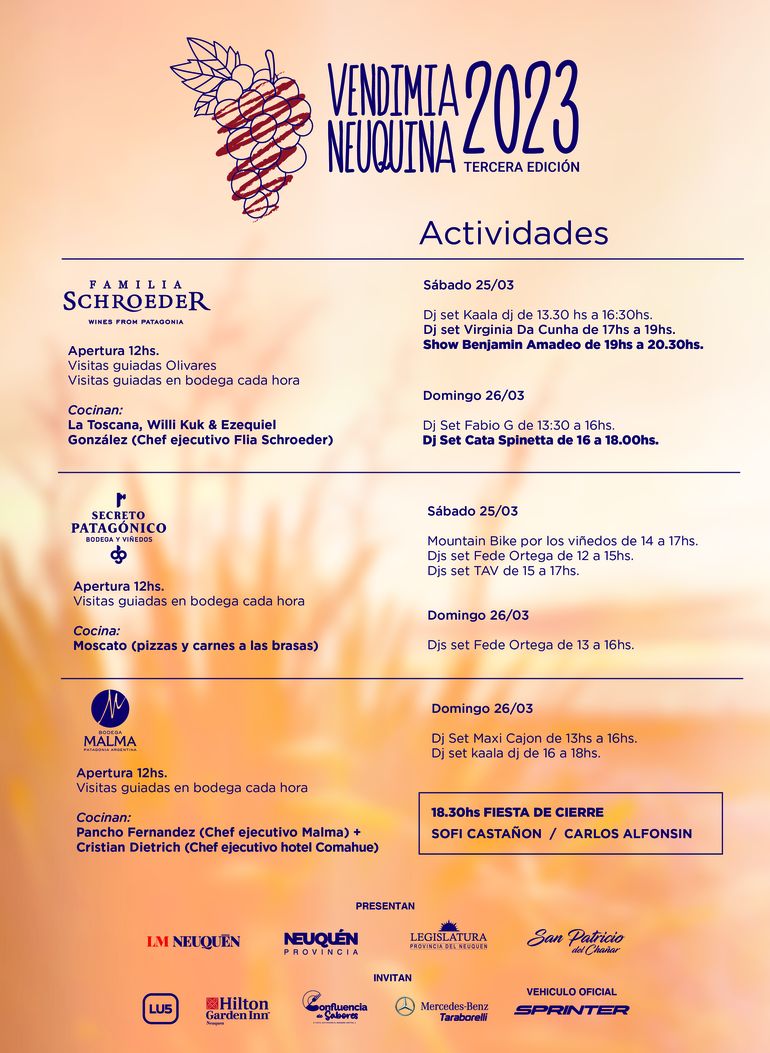 En esta edición, las bodegas anfitrionas Malma, Familia Schroeder, Secreto Patagónico y Bodega del Fin del Mundo abrirán sus puertas a la comunidad y a los visitantes, ofreciendo diferentes actividades, como visitas guiadas, catas, propuestas gastronómicas con chefs invitados y residentes, shows musicales y DJ sets que acompañarán el atardecer, entre otras propuestas que se desarrollarán durante las dos jornadas.