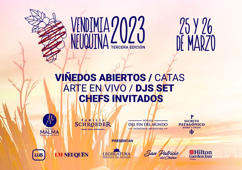 El festejo de III Edición de la Vendimia Neuquina se realizará el próximo 25 y 26 de marzo, en tres bodegas neuquinas (Malma, Familia Schroeder y Secreto Patagónico), con actividades deportivas, “viñedo abierto”, catas de platos y sesiones de DJs.