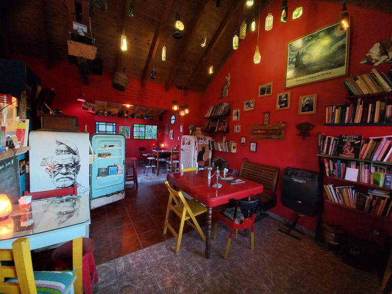 Una vieja heladera Siam llena de libros; la voz inconfundible de Lasha de Sela llenando los espacios como un fantasma; un gato dibujado en la pared y otro que pasa por la ventana; dos mujeres sentadas con un mazo de Tarot sobre la mesa; un grupo de amigos que pide su primera ronda de cerveza; un puñado de botellas colgando del techo, el hombre que llega y saluda con un beso a todos los presentes. Mientras el sol cae y el volcán Batea Mahuida va cubriéndose de estrellas, Magma enciende sus luces de colores, las velas, las sonrisas y la noche sobre el Lago Aluminé.