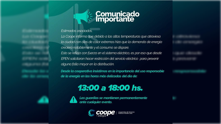 Desde la Cooperativa de Servicios Públicos de Plottier, se difundió este jueves un comunicado oficial en el que se explicó que las altas temperaturas y las olas de calor extremo provocaron un aumento significativo de la demanda energética, lo que impactó directamente en el sistema eléctrico local. En ese contexto, se informó que el EPEN solicitó aplicar restricciones preventivas en el servicio para evitar fallas mayores en la distribución.