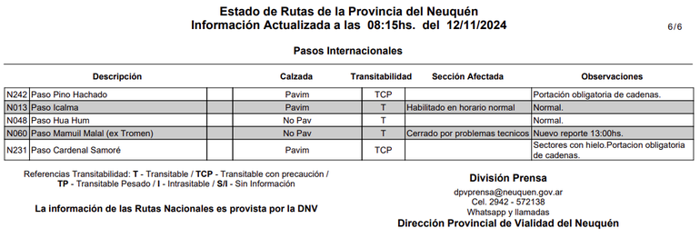 Desde Protección Civil de Junín de los Andes confirmaron que el paso Mamuil Malal quedará habilitado de manera normal este miércoles desde las 8 de la mañana.