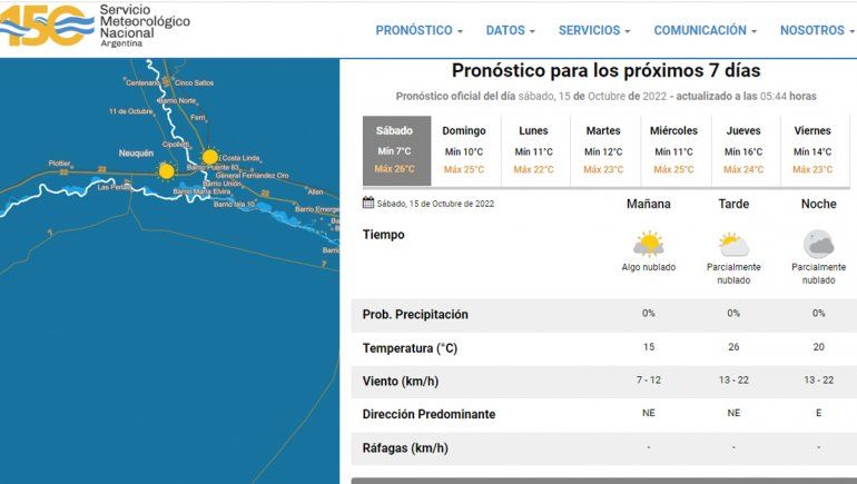 El Servicio Meteorológico Nacional (SMN) anticipó que el Alto Valle tendrá una mañana templada con una temperatura de 15 grados y cielo algo nublado. Hacia la tarde estará parcialmente nublado y la temperatura alcanzará una máxima de 26 grados. Mientras que por la noche descenderá a los 20 grados. Durante la primera parte de la jornada estará apacible y a partir de la tarde se espera viento leve que no superará los 22 kilómetros por hora.