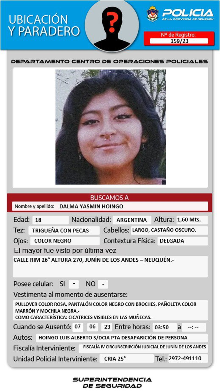 La adolescente de Junín de los Andes está identificada como Dalma Yasmín Hoingo y, según la denuncia radicada en la Comisaría 25°, fue vista por última vez cuando circulaba por calle Rim N° 26 de esa localidad cordillerana.