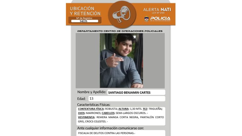 La Policía de la Provincia de Neuquén emitió una alerta Nati para dar con el paradero de un adolescente que desapareció de su domicilio en las últimas horas. Este martes fue anunciado oficialmente la búsqueda de parte de la fuerza policial de Santiago Benjamín Cartes.
