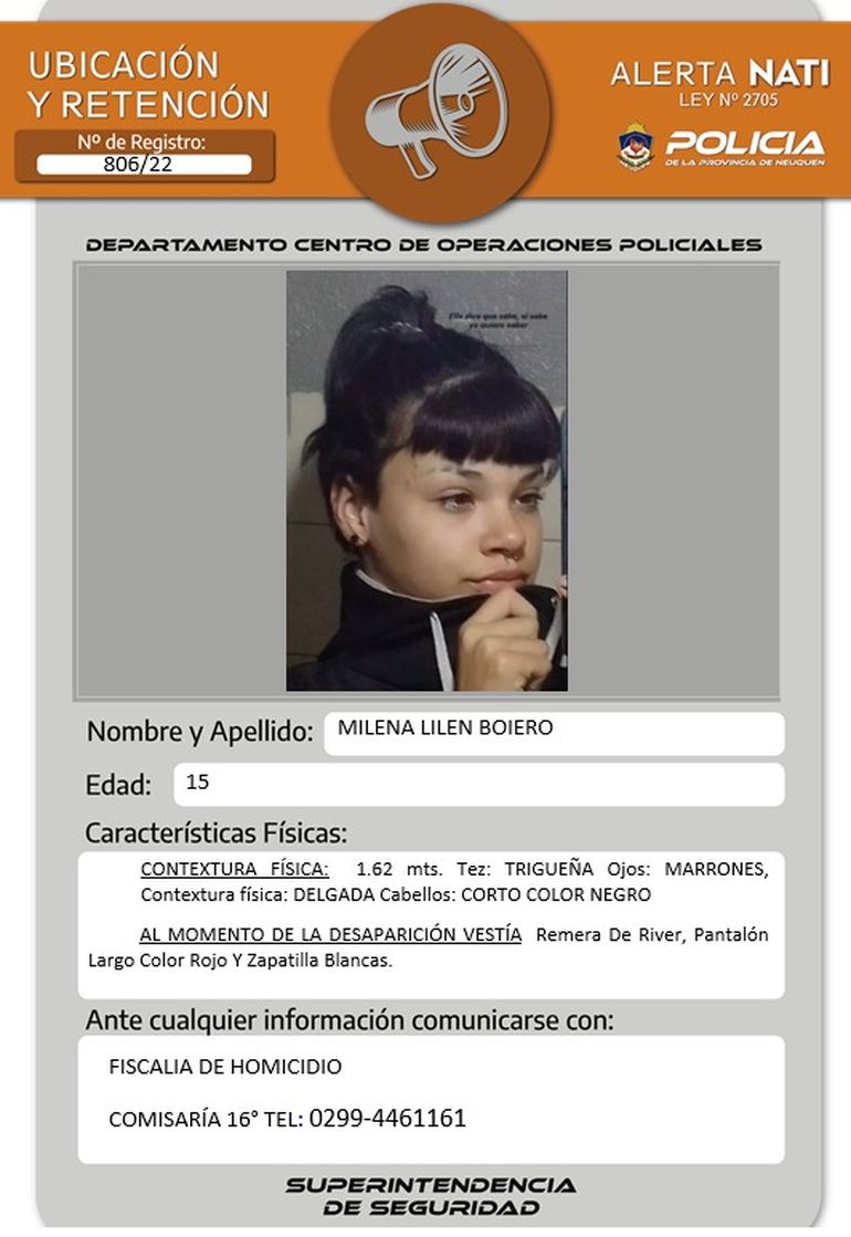 Desde la Policía solicitaron a la comunidad que ante cualquier información que ayude a dar con el paradero de la adolescente se comuniquen con la Fiscalía de Homicidio o con la Comisaría 16°, al siguiente número telefónico: (299) 446-1161.