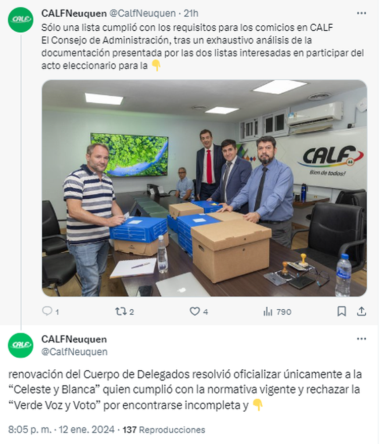 Según se informó desde la entidad, “tras un exhaustivo análisis de la documentación presentada por las dos listas interesadas en participar del acto eleccionario para la renovación del cuerpo de delegados, resolvió oficializar únicamente a la Celeste y Blanca, quien cumplió con la normativa vigente y rechazar la Verde Voz y Voto por encontrarse incompleta y por no cumplir así con las exigencias que establece el estatuto de la Cooperativa”.