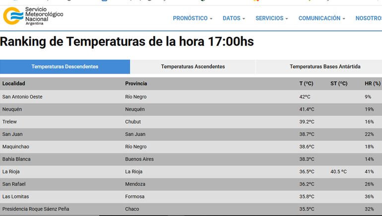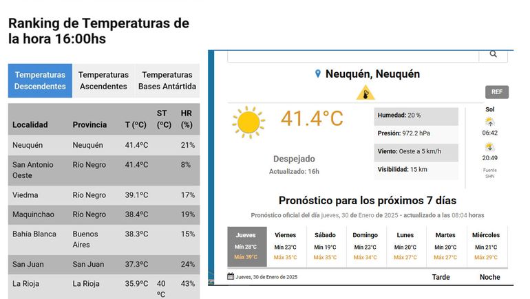 La ola de calor no da respiro a los neuquinos. El Servicio Meteorológico Nacional emitió para este jueves una alerta amarilla por altas temperaturas, Neuquén sigue estando entre las ciudades más calurosas del país. Si ayer alcanzó los 39.2 grados de máxima, hoy el termómetro registró 41.4 grados a las 16 y se posicionó como líder del ranking de temperaturas junto a la ciudad rionegrina de San Antonio Oeste, seguida de Viedma con 39.1 grados.