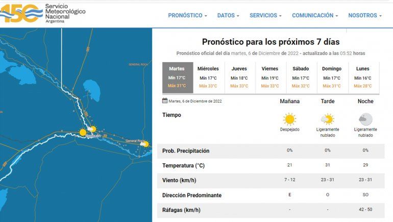 Para las próximas dos jornadas el pronostico del SMN advierte vientos fuerte y ráfagas de intensidad variable. El miércoles predominará el viento y el calor en la región. Por la madrugada estará algo nublado con una temperatura de 17 grados y por la mañana pasará a estar mayormente nublado con una temperatura de 22 grados. En horas de la tarde alcanzará la máxima prevista en 33 grados y por la noche descenderá a los 22. Se sentirá a partir de la tarde el viento de casi 60 kilómetros por hora con ráfagas de entre 79 y 87 kilómetros por hora.