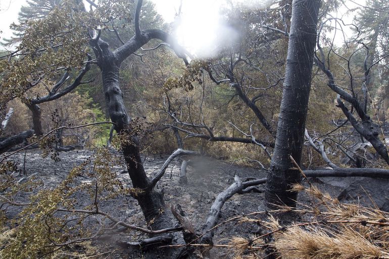 La recorrida que hicimos con el fotógrafo, guiados por uno de los integrantes del Comité de Emergencia, por uno de los cerros afectados por el incendio fue una experiencia inolvidable en mi carrera periodística. A pesar de las dificultades por las que debíamos atravesar para llegar al cerro y así estar lo más cerca posible, con todas las precauciones del caso, del accionar de los brigadistas que trabajaban sin descanso para retroceder el fuego unos tres kilómetros hacia la línea de una picada de la zona del Rehue, una zona sagrada para los mapuches donde hacen sus ceremonias religiosas. Hicimos ese complicado trayecto, donde máquinas y topadoras fueron abriendo camino para la llegada de los brigadistas. El panorama a nuestro alrededor era de lo más entristecedor: araucarias y demás especies totalmente devastadas por el fuego, mucha ceniza y mucho rescoldo -brasa encendida y activa- de unos 30, 40 centímetros.