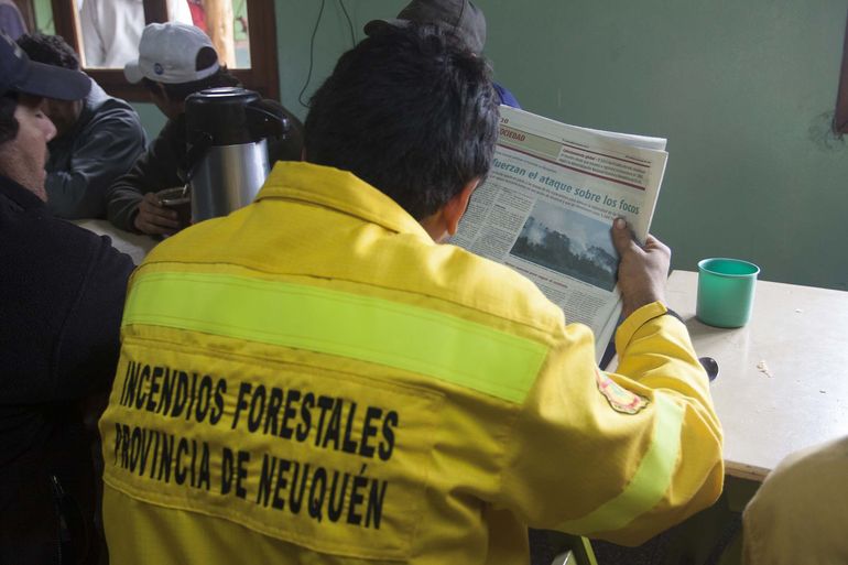 “Parecía que había reventado un volcán”, fue lo primero que escuché cuando, con el fotógrafo (Bruno Tornini), llegamos a la zona afectada mientras a nuestro alrededor un grupo de brigadistas apresuraban su preparación para dirigirse a uno de los cerros para combatir las llamas. La persona que describió aquella comparación era John Cuiñas, coordinador del Sistema Provincial del Manejo del Fuego, a quien conocía por teléfono ya que era quien todos los días nos daba información acerca de lo que acontecía con el incendio mientras lo cubría desde la redacción del diario. Una tarde se tomó la decisión de viajar hasta la zona del incendio.