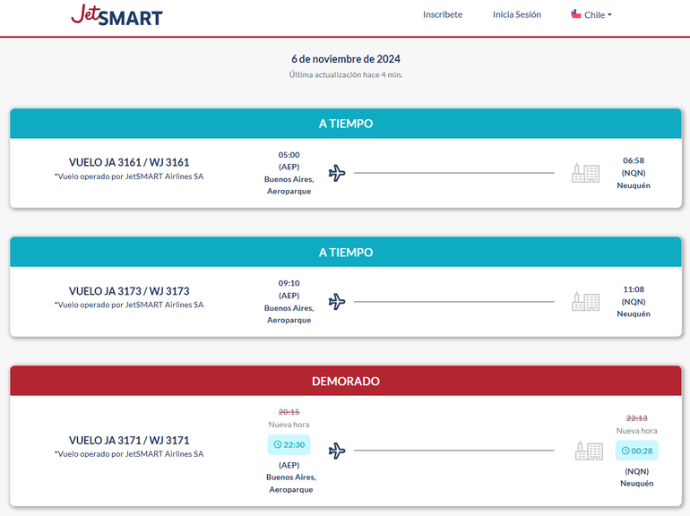 Para mayor información, los pasajeros pueden hacer su consulta online en https://jetsmart.com/cl/es/estado-de-vuelo/resultados