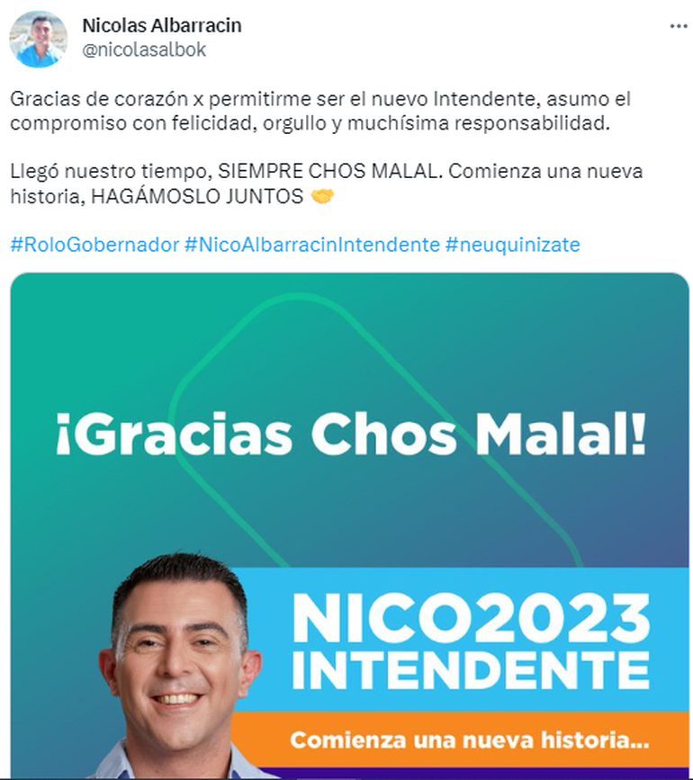 En Chos Malal se alzó con el triunfo Nicolás Albarracín, candidato por Comunidad que le competía mano a mano con Diego de la Vega, continuidad de la gestión del intendente Hugo Gutiérrez.