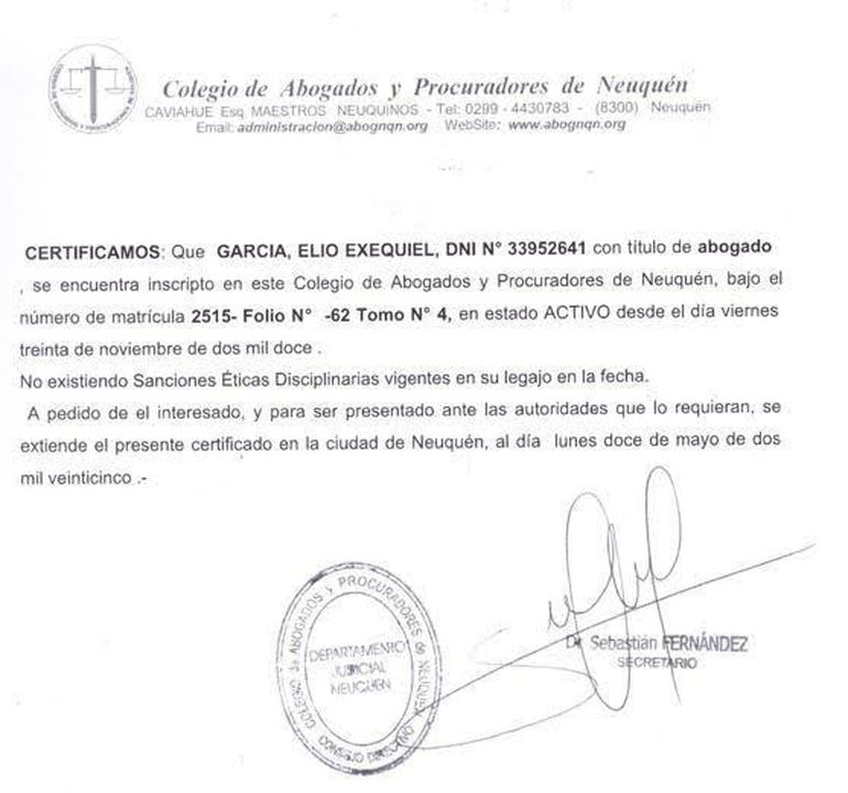 No soy ajeno a las vicisitudes que enfrentamos los abogados que intervenimos en causas de alta exposición pública, donde con frecuencia se utilizan argumentos o expresiones agraviantes contra quienes ejercemos el derecho de defensa. Es algo que asumo y con lo que convivo a diario, sin mayores problemas. Pero existen límites. La incomodidad que ciertos casos puedan generar no justifica que se me embarre, especialmente cuando, en casi quince años de ejercicio profesional en el fuero penal, no pesa sobre mi legajo ni una sola sanción disciplinaria, como lo acredita el certificado suscripto por las autoridades del Colegio de Abogados que acompaña esta nota.