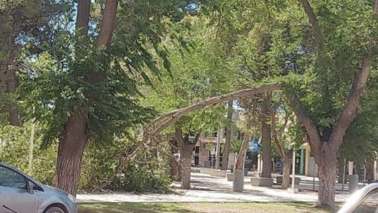 El hecho sucedió el sábado a las 13.30, según consignó el portal Centenario Digital, en el momento en que grandes ramas cayeron en la vereda cerca de unos bancos de cemento, sobre la calle Intendente Pons, frente al edificio de la Municipalidad de Centenario.