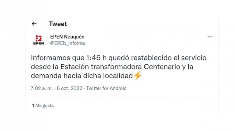 Desde el Ente Provincial de Energía del Neuquén (EPEN) informaron este miércoles que “a la 1:46 quedó restablecido el servicio desde la Estación transformadora Centenario y la demanda hacia dicha localidad”.