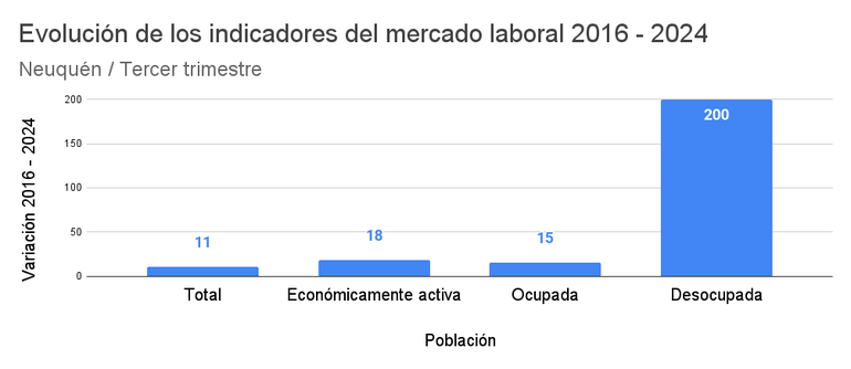 En comparación con la del tercer trimestre de 2016 muestra crecimientos del 11% en la población total, del 18% en la tasa de actividad, del 15% en la de ocupación y del 200% en la de desocupación.