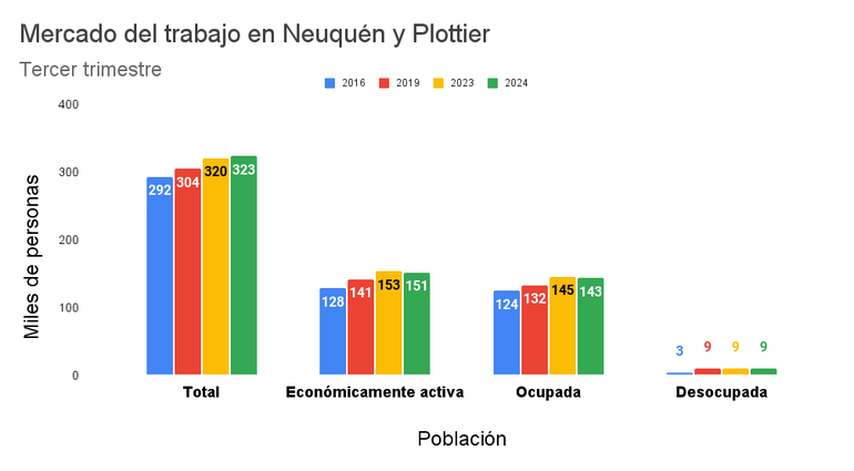 En el tercer trimestre, el INDEC estimó que en Neuquén y Plottier la demanda de trabajo reunía a unos 28 mil trabajadores, unos 9 mil desocupados más 19 mil ocupados que buscaban otro puesto.