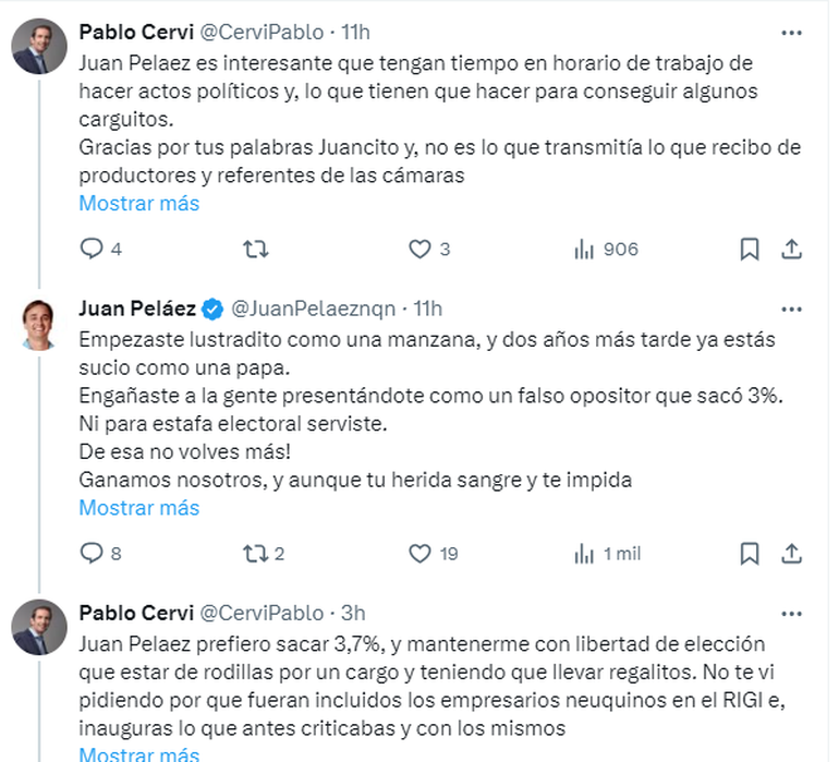 Cervi no se quedó callado y retrucó: "Tanto hablar de cambiar la continuidad de 60 años del MPN y terminas abrazado a ellos y entregando cualquier posibilidad de plantear algo a distinto". "Son más de lo mismo y, ahora quieren entregar el partido como ofrenda para sostener carguitos. Casta pura!", le apuntó.