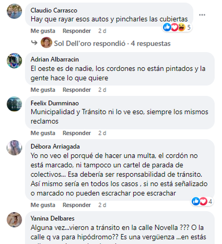 Otros usuarios reaccionaron al posteo y aseguraron que el tránsito en calle Novella es muy complicado casi “tierra de nadie” y “los automovilistas estacionan a donde quieren”. “En muchos lugares no están los cordones pintados, no sé si corresponde multar. Pero todos saben que eso es parada de cole”, cuestionaron algunos internautas.
