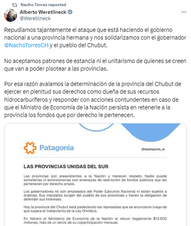El gobernador Ignacio Torres publicó en las redes sociales un duro comunicado que fue acompañado por otros mandatarios como Rolando Figueroa y Alberto Weretilneck.