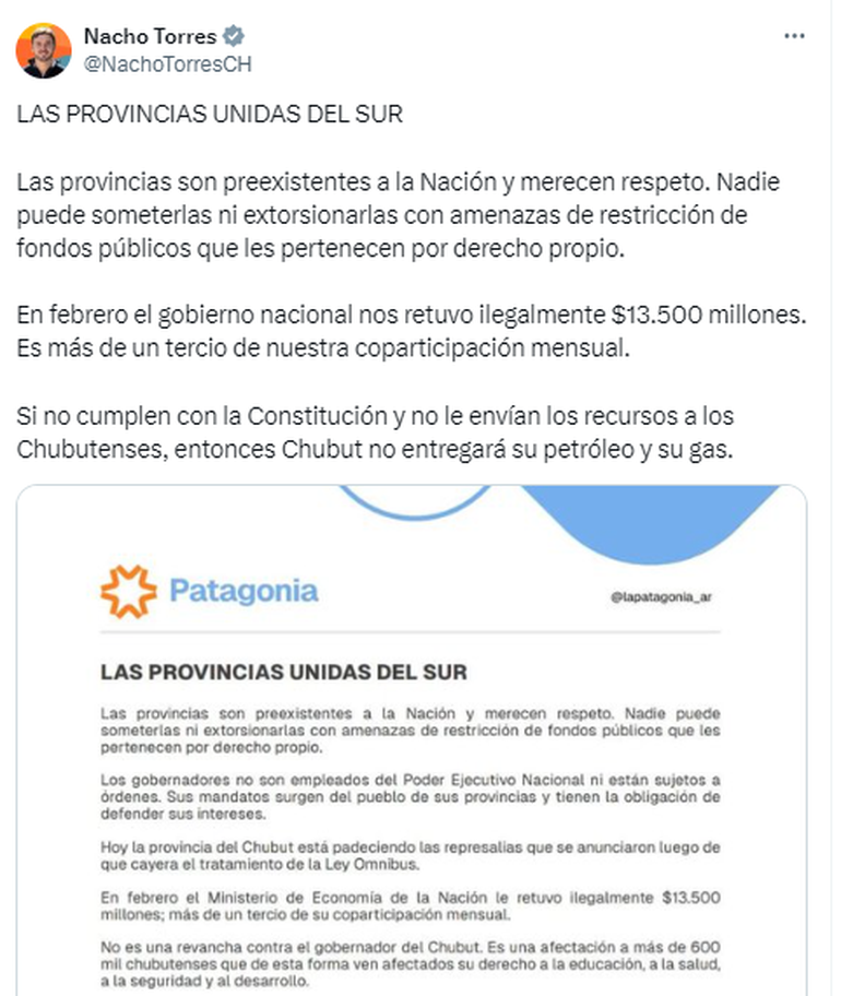 Agregó: "Hoy la provincia del Chubut está padeciendo las represalias que se anunciaron luego de que cayera el tratamiento de la Ley Ómnibus. En febrero, el Ministerio de Economia de la Nación le retuvo ilegalmente $13.500 millones; más de un tercio de su coparticipación mensual".