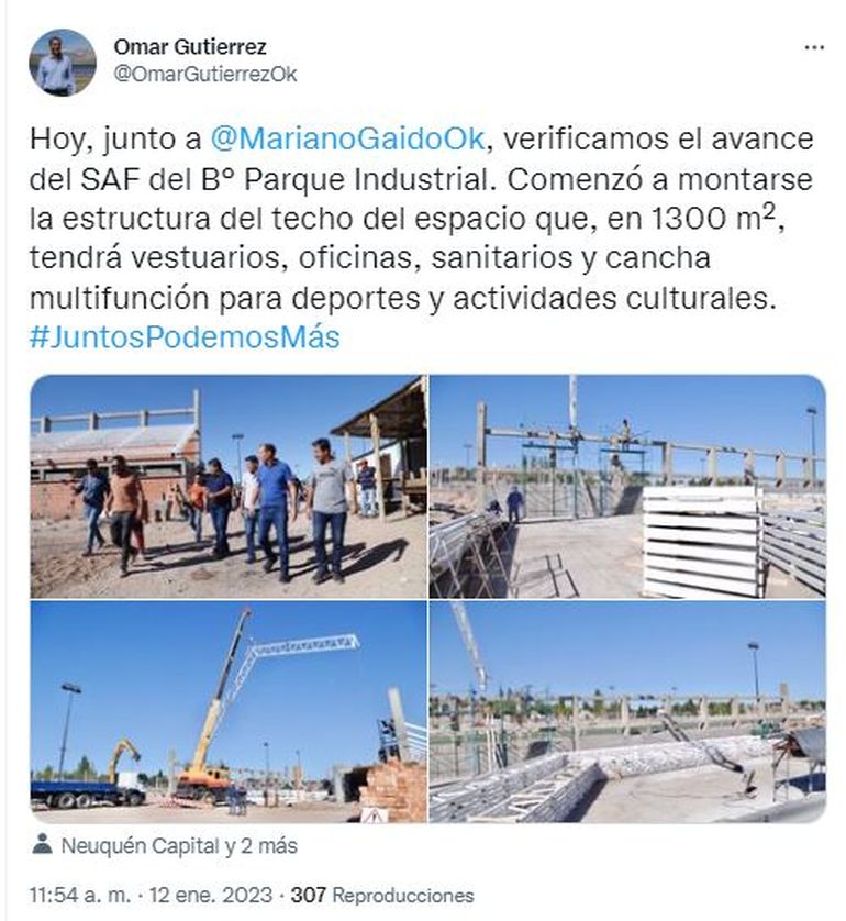 “Es una obra del Plan Capital, un nuevo polideportivo en la ciudad que hoy comenzó a techarse. Es un momento histórico en este barrio”, expresó el intendente quien destacó que serán cinco los gimnasios que el municipio construirá en Neuquén.