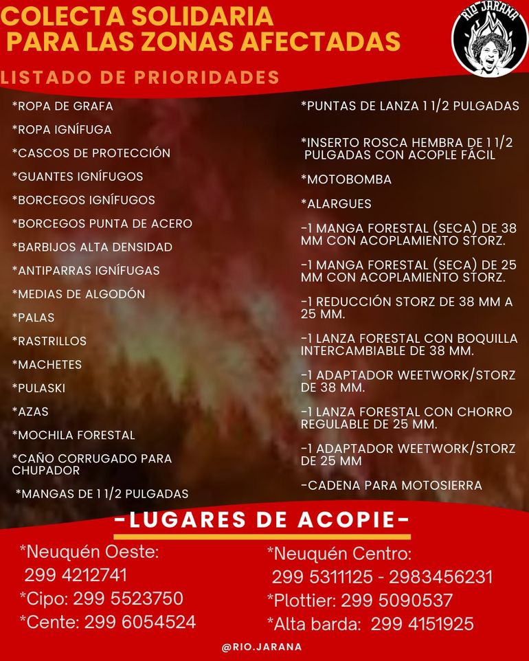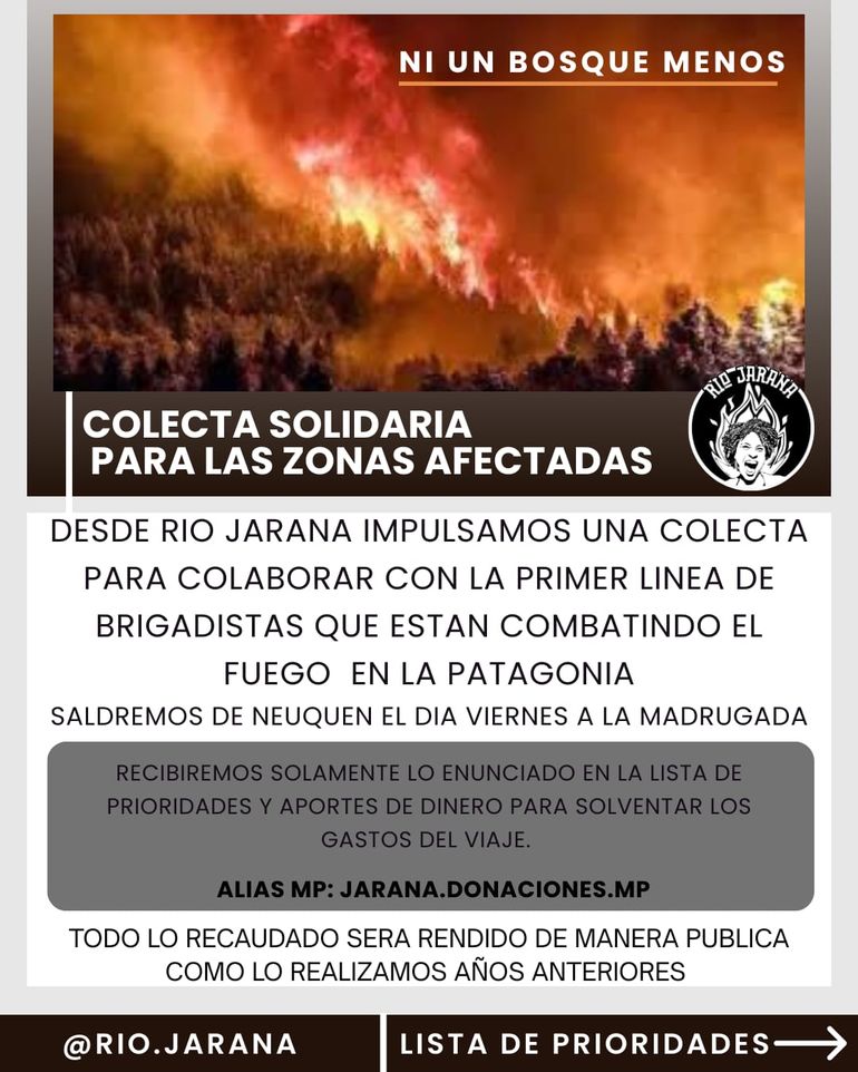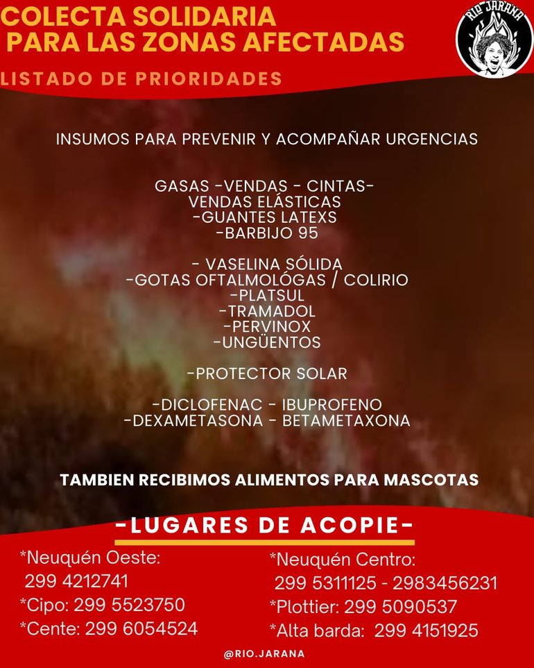Frente a este escenario, desde Neuquén se lanzó una colecta solidaria impulsada por la artista Luciana Quiroga, en articulación con el colectivo Río Jarana, que desde hace años organiza campañas de ayuda ante incendios en la Patagonia. La propuesta apunta a reunir insumos prioritarios que permitan acompañar urgencias médicas, prevenir infecciones y reforzar el trabajo en terreno.