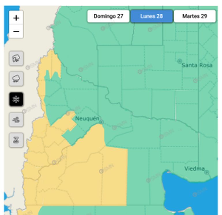 Según la información suministrada por la estación meteorológica del Aeropuerto Internacional de Neuquén, las zonas donde se esperan las condiciones más adversas incluyen: