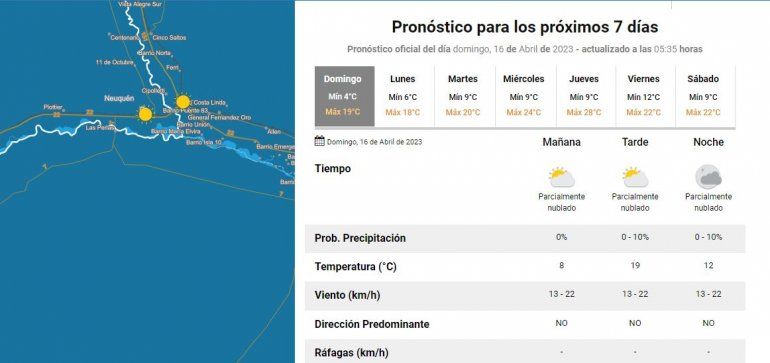 Comenzó fresco este domingo en que los neuquinos concurrirán a las urnas para elegir autoridades provinciales. Se prevé una mínima de 4 grados y una máxima de 19 grados en la región. Si bien comenzó parcialmente despejado hay una mínima posibilidad de precipitaciones.
