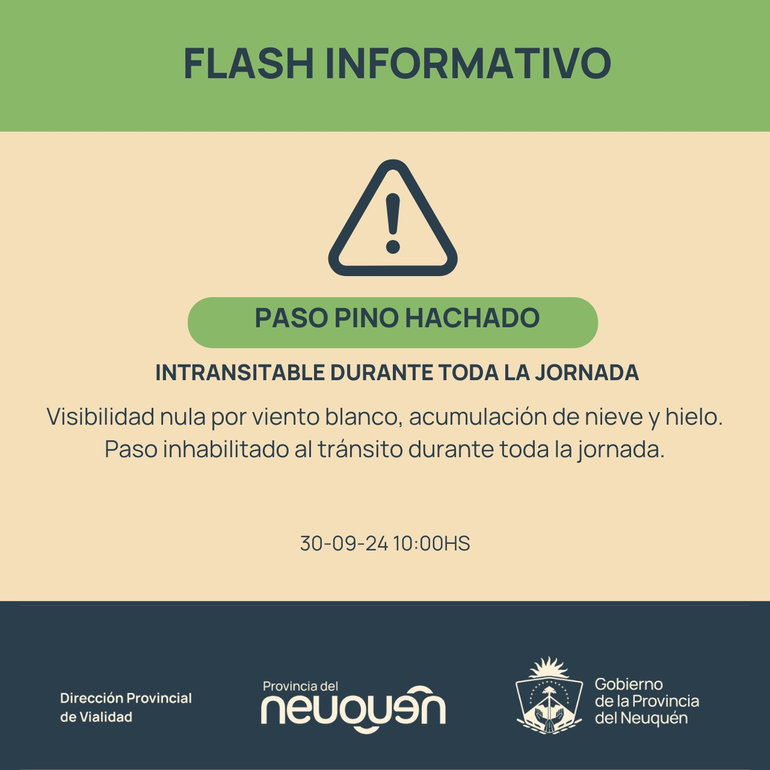 Cerca de las 10:30, Vialidad informó que el paso Pino Hachado se encontrará inhabilitado por toda la jornada del lunes por "visibilidad nula por viento blanco, acumulación de nieve y hielo"