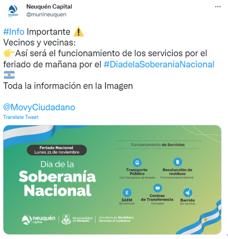 El feriado del domingo 20 de noviembre por la celebración del Día de la Soberanía Nacional, fue trasladado al lunes 21 por fines turísticos. De esta forma, el funcionamiento de los servicios en la ciudad de Neuquén puede presentar algunos cambios.