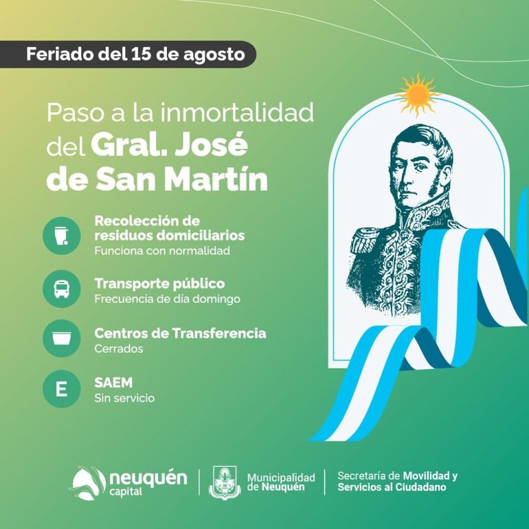 Este miércoles 17 de agosto se conmemorará el Paso a la Inmortalidad del General José de San Martín, pero el calendario nacional indica que se trata de un feriado trasladable, por lo que el asueto pasó para este lunes. De este manera, los servicios locales se verán afectados.