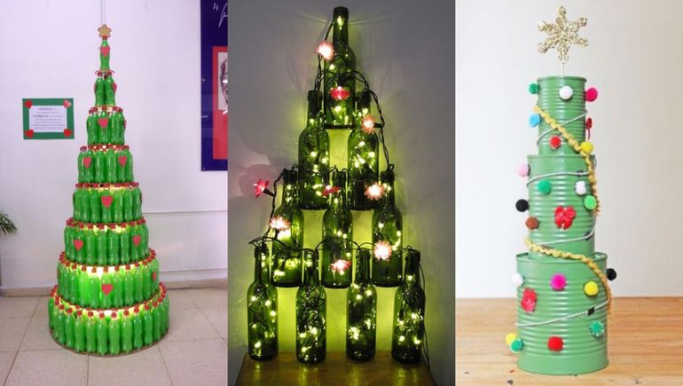 Una gran idea, que además rompe el molde de los tradicionales arbolitos, es la de armar la estructura del árbol con botellas de plástico o vidrio, o con latitas de gaseosa o pintura, armando una pirámide. Luego se le puede agregar cualquier tipo de decoración, dibujos hechos en papel, cintas de colores, o utilizar luces de años anteriores para iluminar.