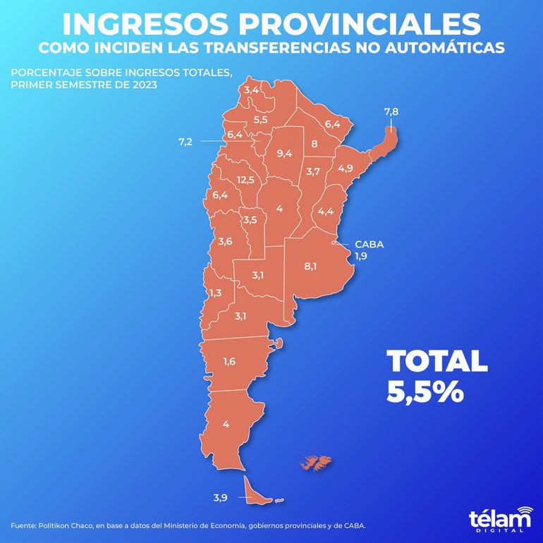 Un informe de la consultora Politikon Chaco, en base a datos del Ministerio de Economía nacional y de los gobiernos provinciales, da cuenta de un total de transferencias no automáticas o discrecionales de la Nación al total de 24 distritos de $ 648.156 millones al segundo semestre de 2023.