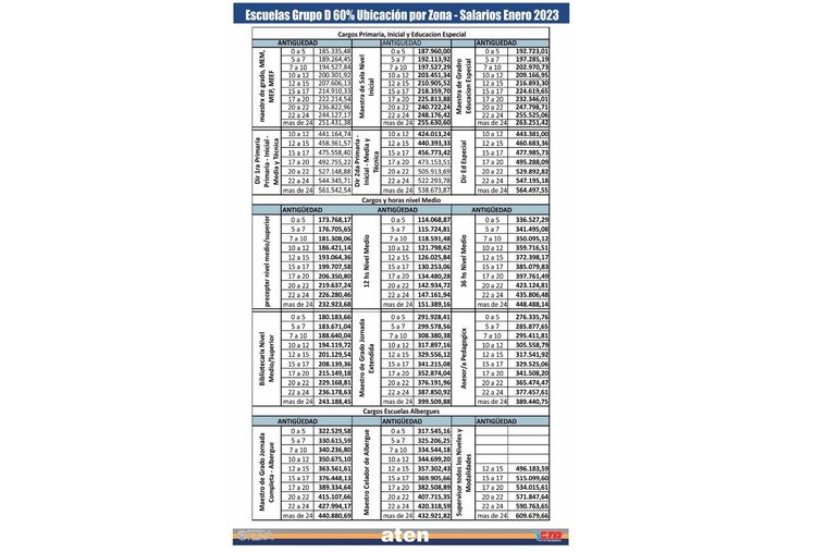Al compartir las grillas, desde ATEN recordaron que "rige la Ley sobre exclusión del 40% de los haberes del cálculo del impuesto a las ganancias". "Para obtener el monto sobre otros cargos, multiplicar el salario percibido en diciembre × 1,17. Si no, consultar con lxs crxs de las Seccionales o a esta Comisión Directiva Provincial", indicaron en el posteo en un posteo en Facebook.