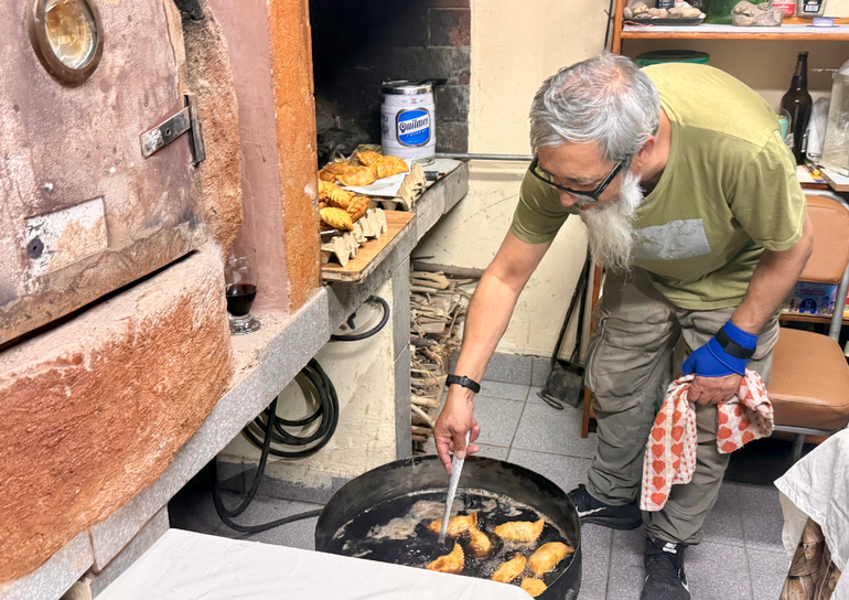 Las empanadas crujen y bailan en la grasa, bajo la atenta mirada de Javier y su papá, que las van pescando con una espumadera y colocándolas sobre una capa de papel de rollos de cocina. A esta altura de la noche hay unas cuentas botellas de vino abiertas y corchos tirados en el piso. Alguien preparó un vaso de gaseosa de pomelo con tinto, que también anda de mano en mano. De fondo se escuchan las risas de los nietos; la más chiquita ya es adolescente. Cada tanto uno de ellos se sale de la ronda para ir a darles un abrazo a los abuelos.